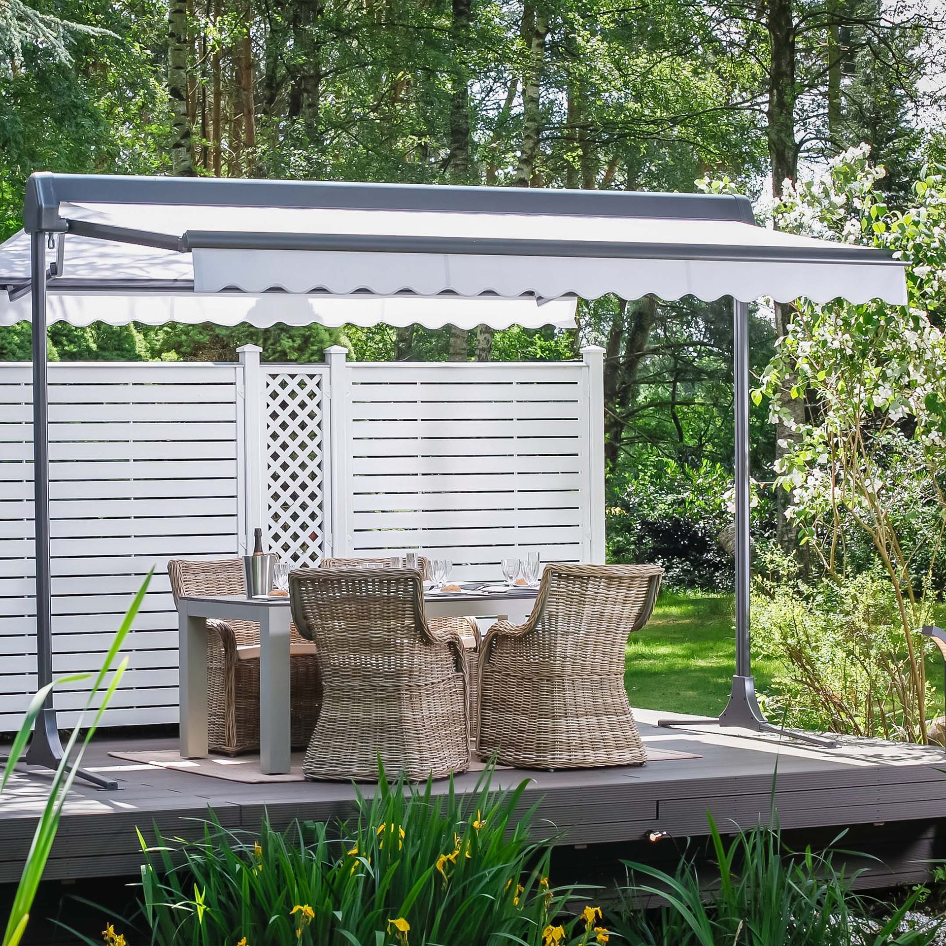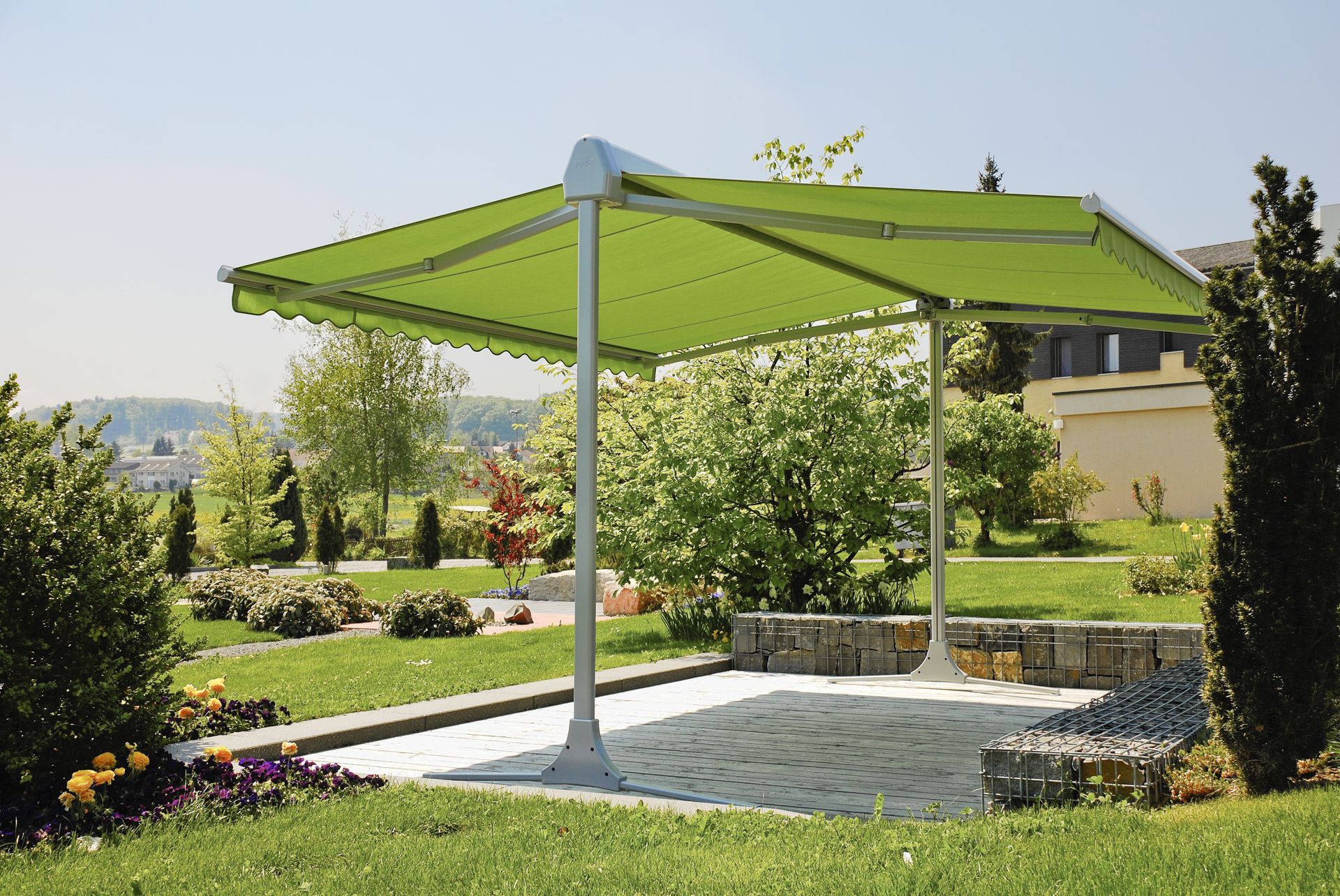 Freistehende Doppelmarkise mit Schutzdach